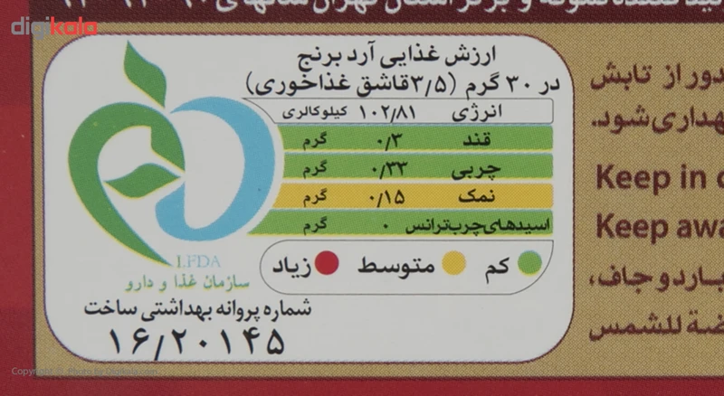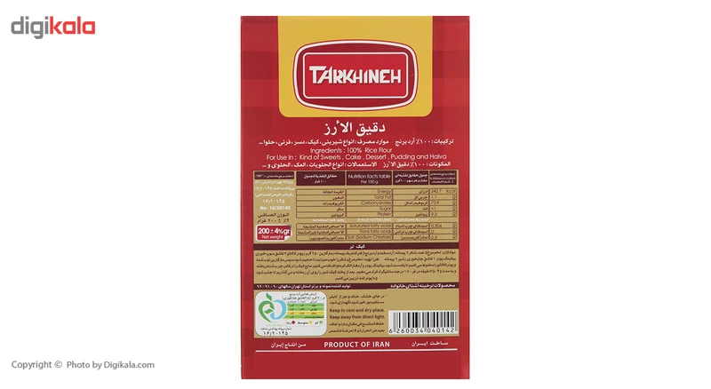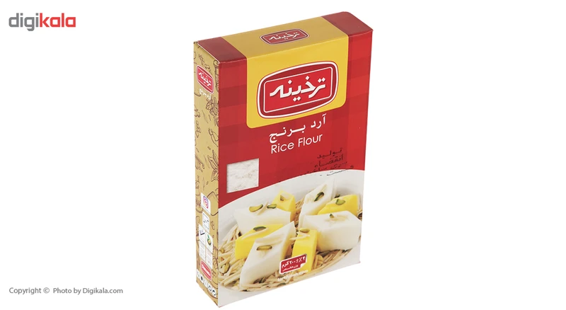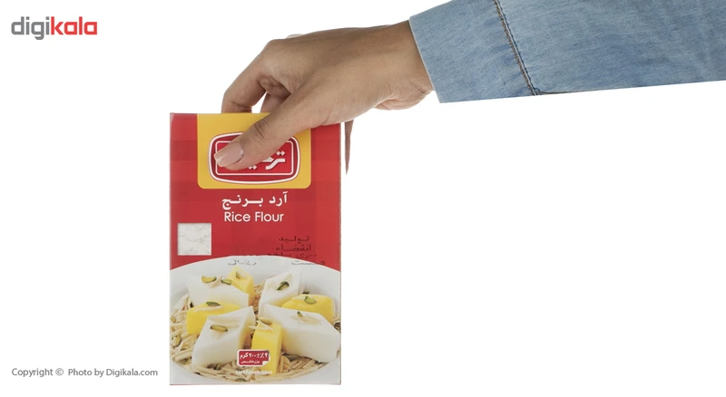 محصولی که می‌بینیم آرد برنج برند «ترخینه» است که در بسته‌بندی با ابعاد 16 × 10 × 3 سانتی‌متر عرضه شده و حاوی 200 گرم آرد برنج است. از این محصول می‌توان در تهیه انواع شیرینی، دسر، فرنی و حلوا استفاده کرد. آرد برنج می‌تواند فیبر مورد نیاز بدن انسان را تامین کند. آرد برنج فاقد گلوتن است. گلوتن پروتئینی است که باعث تحریک و آسیب رساندن به سیستم گوارشی بدن می‌شود و از این رو برای کسانی که مبتلا به بیماری سلیاک هستند، یک جایگزین مناسب و عالی است. آرد برنج دارای فیبر بالایی است. ارزش غذایی در هر 30 گرم آرد برنج، برابر با 102.81 کیلوکالری انرژی، 0.3 گرم قند، 0.32 گرم چربی، 0.15 گرم نمک بوده و فاقد اسیدهای چرب ترانس است.
