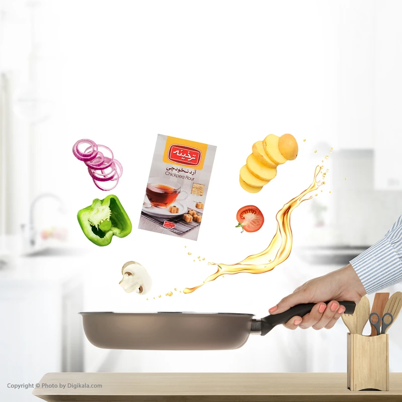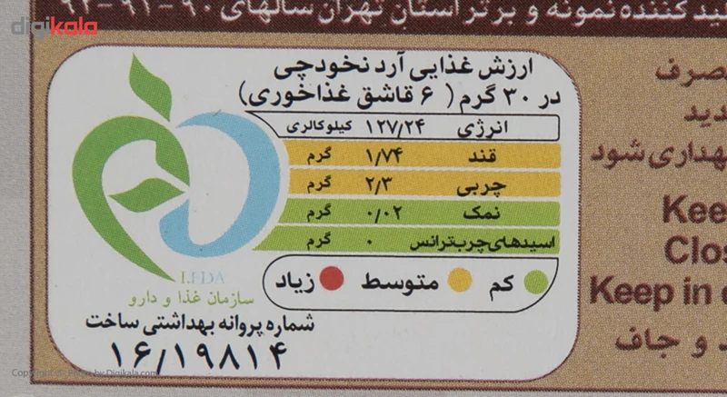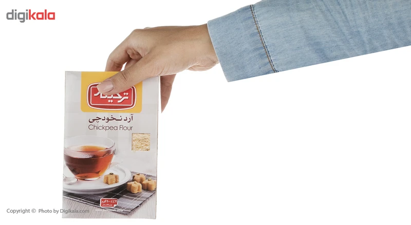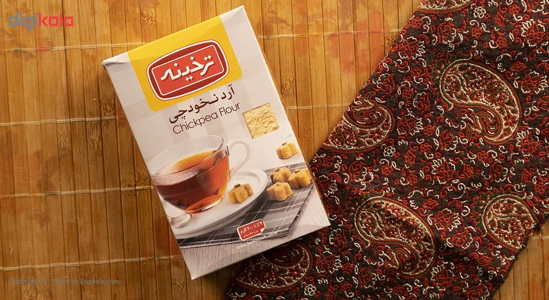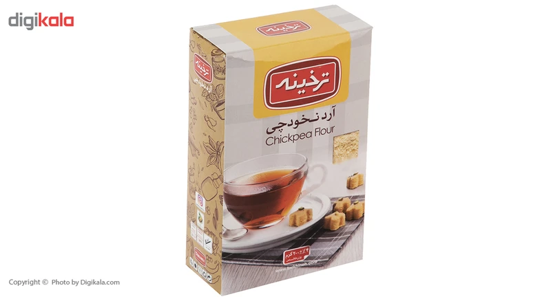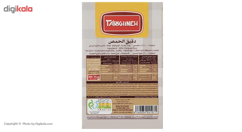 محصولی که میبینیم آرد نخودچی برند «ترخینه» است که در بستهبندی با ابعاد 16 × 10 × 3 سانتیمتر عرضه شده و حاوی 200 گرم آرد نخودچی است. از این محصول میتوان در تهیه انواع شیرینی، کوکو، کوفته و شامی استفاده کرد. آرد نخودچی یک جایگزین مناسب و عالی برای حبوبات است. ارزش غذایی در هر 30 گرم آرد نخودچی، برابر با 127.24 کیلوکالری انرژی، 1.74 گرم قند، 2.3 گرم چربی، 0.02 گرم نمک بوده و فاقد اسیدهای چرب ترانس است.
