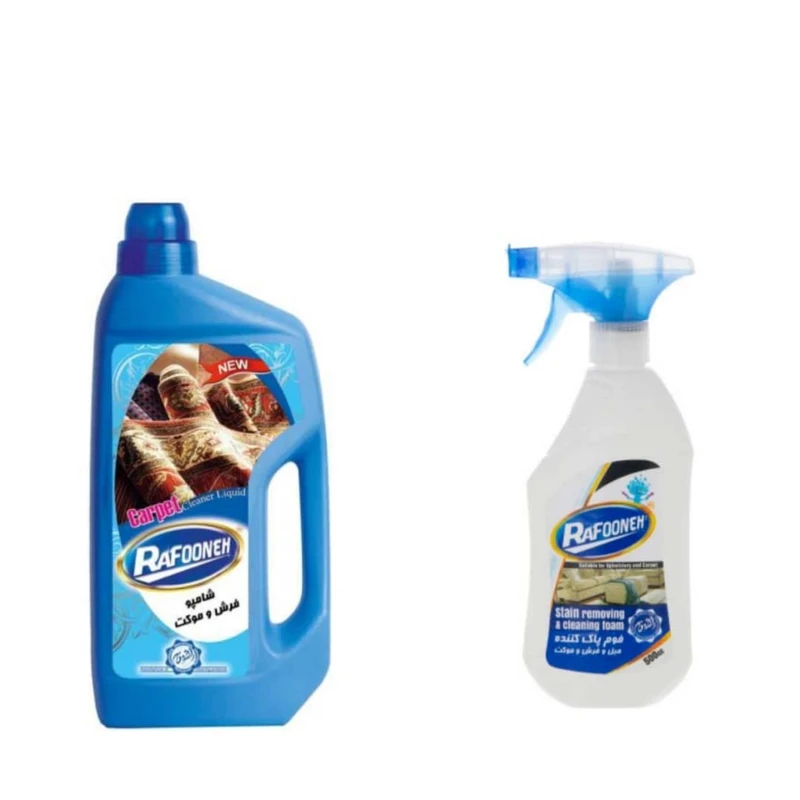 اسپری فوم لکه بر مبل و فرش و موکت رافونه 500 میلی لیتر به همراه یک عدد شامپو فرش مدل 00023 حجم 1 لیتر
