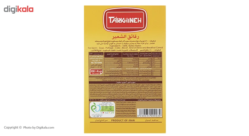 این محصول جو پرک برند «ترخینه» مقدار 200 گرمی است که در بستهبندی با ابعاد 16 × 10 × 3 سانتیمتر عرضه میشود. جوی پرک «ترخینه» یک ماده غذایی عالی است و بسیار سریع میپزد. جوی پرک خطر ابتلا به بیماریهای قلبی، افزایش فشار خون را کاهش میدهد. ارزش غذایی در هر 45 گرم جو پرک «ترخینه» برابر با 148 کیلوکالری انرژی، 1.28 گرم قند، 0.22 گرم چربی بوده و فاقد نمک و اسیدهای چرب ترانس است.