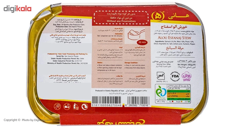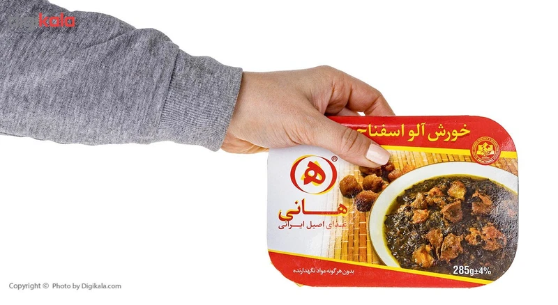 آلو اسفناج خورشی پرخاصیت است و محبوب است که طرفداران خاص خود را دارد. این غذای لذیذ از گوشت، اسفناج و آلو خورشتی تشکیل شده و توسط هانی بهصورت آماده درآمده تا افرادی که زمان کافی برای پخت این غذا را ندارند، بتوانند از آن لذت ببرند. با در اختیار داشتن این محصول هانی فقط کافی است برنج را دم کنید و درگیر مراحل آشپزی نشوید.خورش آلو اسفناج تا 24 ساعت پس از بازکردن قابل استفاده است و 285 گرم وزن دارد. بستهبندی این غذای آماده به بهترین شکل انجام شده و هانی برای احترام به محیط زیست و نگهداری بهتر غذا از آلومینیوم برای ساخت آن استفاده کرده است. برای گرمکردن خورش آلو اسفناج هانی، میتوانید از ماکروویو استفاده کنید اما در آن باید باز باشد تا غذا بهخوبی گرم شود.