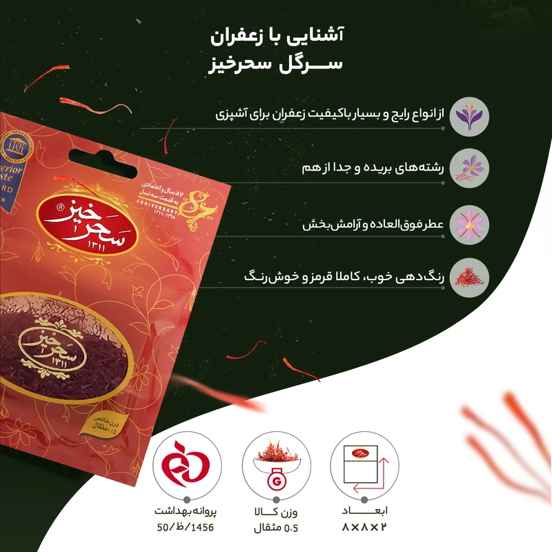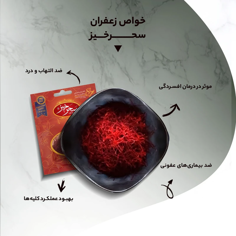 برای استفاده از زعفران و رنگدهی آن راههای زیادی مانند دمکردن آن یا ریختن آن روی یخ است. زعفران سحرخیز مقدار 4.608 گرم یکی از زعفرانهای خوب عرضه شده در بازار است. این زعفران از نوع رشتهای بریده است که در بستهبندی مقوایی توسط «سحرخیز» تولید و عرضه شده است.زعفران چاشنی و رنگدهنده طبیعی پرخاصیتی است که از آشپزی ما ایرانیان به هیچوجه کنار نمیرود. زعفران یکی از محبوبترین ادویههاست که آن را از گل زعفران میگیرند. این ادویه باارزش، باکیفیتهای متفاوتی عرضه میشود. زعفران خوب و باکیفیت کمی تلخ است و به آرامی رنگ میدهد، در غیر این صورت باید شک کنید که مواد افزودنی داشته باشد. زعفران گردش خون را بهبود میبخشد و این باعث افزایش متابولیسم بدن میشود. حتما شنیدهاید که زعفران شادیآور است، این ادویه نوعی تاثیر ضدافسردگی بر روی مغز دارد و روی هورمونهای بدن تاثیر میگذارد. زعفران در پخت و تزئین برنج، انواع خورشها و شربتهای ایرانی استفاده میشود و غذا با آن رنگ و طعم بینظیری به خود میگیرد.
