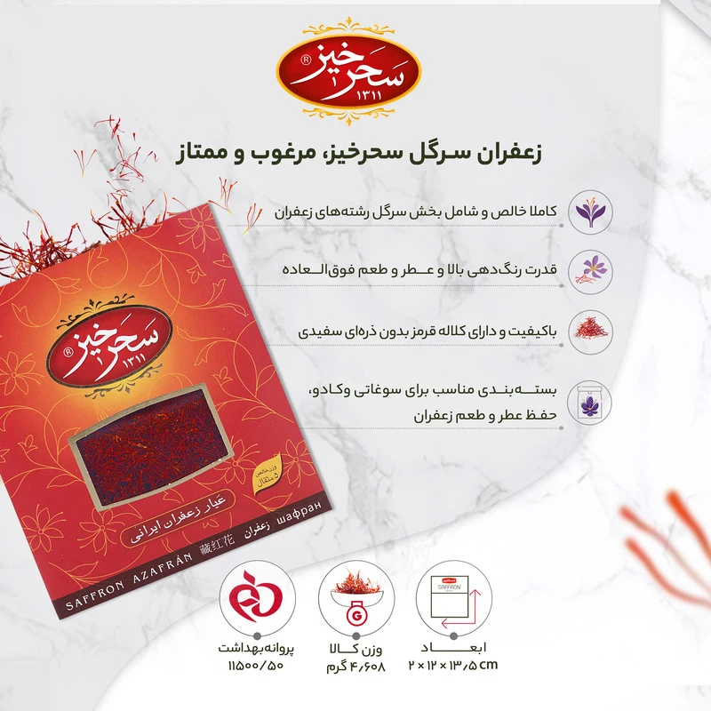 زعفران سحرخیز دربسته بندی یک گرمی محصولی از برند خوشنام سحرخیز است که از سال 1311 به تهیه و تولید زعفران مشغول است. زعفران یک مثقالی سحرخیز از زعفران رشتههای بریده ممتاز و سرگل تهیهشده است. این بخش بهترین و مرغوبترین نوع در تهیه زعفران به شمار میرود. این زعفران بستهبندی شیک و قابل هدیه دادن دارد. بهعلاوه برای استفاده در منزل نیز با توجه به بستهبندی کارآمد آن عطر زعفران همیشه درون گل باقی خواهد ماند. زعفران یکی از گیاهان ارزشمند و پر قدر در فرهنگ ایرانی است که در بیرون از مرزهای ایران حتی بیشتر از داخل ایران ارزشمند و گرانقیمت است. زعفران به دلیل شرایط خاص رشد خود و زحمت بسیاری که در زمان رشد از کشاورز طلب میکند قیمت تمامشدهی بالایی را خواهد داشت و تولید آن به میزان بالا برای جبران تقاضای بازار امکانپذیر نیست. خرید و استفاده از زعفران یک مثقالی سحرخیز میتواند انتخابی مناسب برای هدیه، استفادهی خانگی یا سوغات باشد.