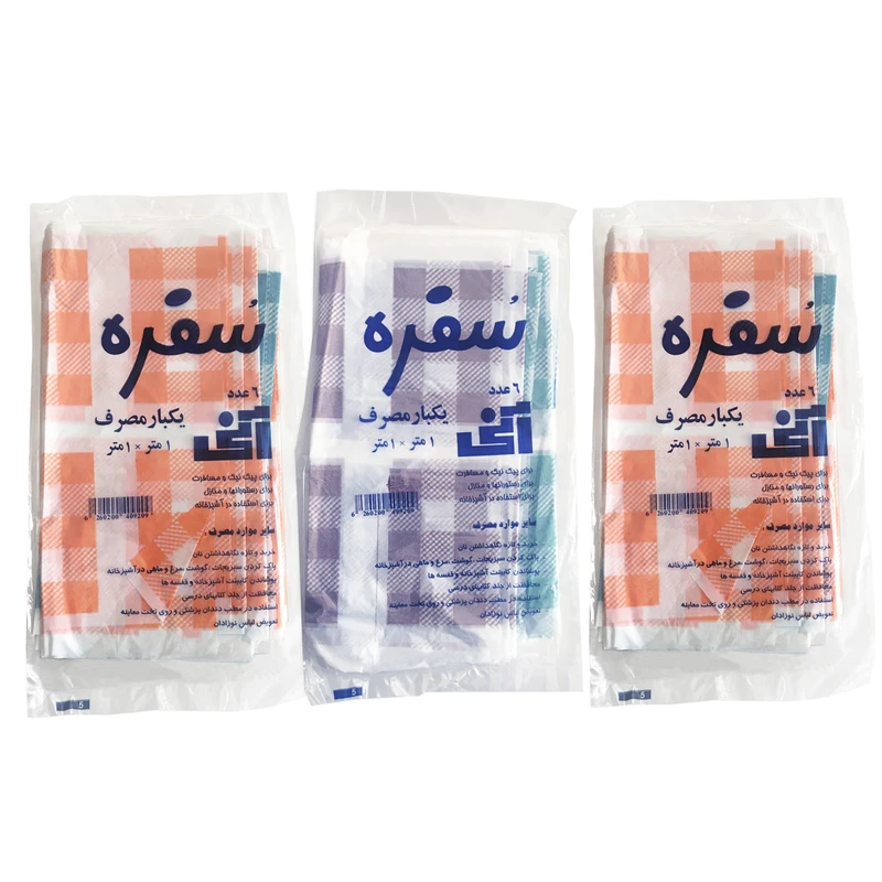 سفره یکبارمصرف پیکنیکی آنی ۳ بسته و هر بسته شامل ۶ عدد سفره در ابعاد ۱ متر در ۱ متر و از پیش برش خورده است که بهراحتی قابل حمل و استفاده است. این سفره از پلی اتیلن غذایی و موادنو، بدونکربنات کلسیم و مواد افزودنی دیگر تولید شده است.