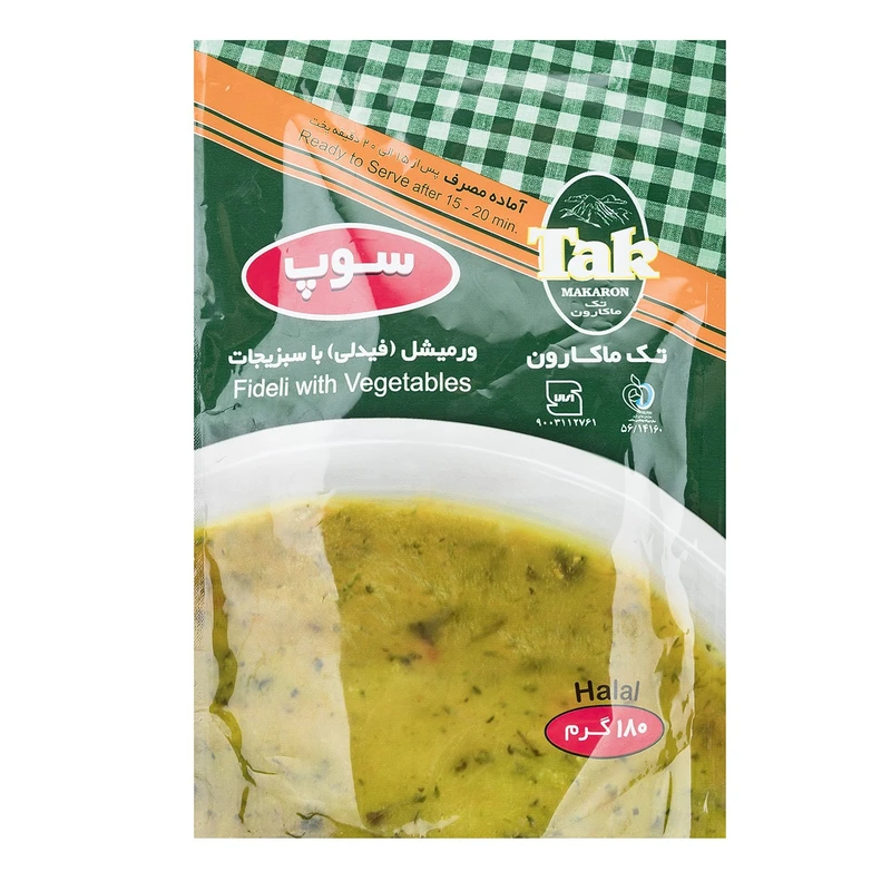حتما برایتان پیش آماده که یکی از اعضای خانواده بیمار باشد و شما زمانی برای آماده کردن سوپ نداشته باشید. همانطور که می‌دانید هم بهترین غذا برای یک بیمار سوپ است. زیرا هم خوردن آن آسان است . هم دارای مواد غنی و ویتامین‌های مغذی است. سوپی ورمیشل سبزیجات «تک ماکارون» که حاوی 180 گرم سوپ خشک بوده، در کمترین زمان ممکن آماده می‌شود. این سوپ تولید شده با آرد سمولینا بوده و دارای سبزیجات خشک شده و معطر است. برای آماده کردن این سوپ فقط کافی است محتوی بسته را داخل یک ظرف حاوی آب سرد بریزید و روی حرارت ملایم قرار دهید. همینطور محتویات قابلمه را هم بزنید تا جوش آید. بعد از اینکه آب به جوش آمد، به هم زدن ادامه دهید و بعد از 20 دقیقه که دیدید کمی غلیظ‌تر از قبل شد، شعله را خاموش کنید و سوپ را نوش جان کنید. سوپ ورمیشل تک ماکارون حاوی مواد کاملا استاندارد بوده و برای بیمار می‌تواند یک وعده غذایی کامل باشد.
