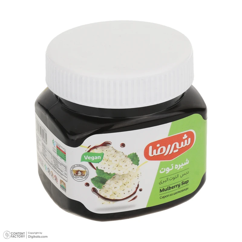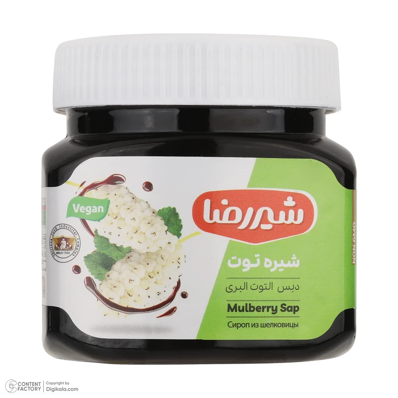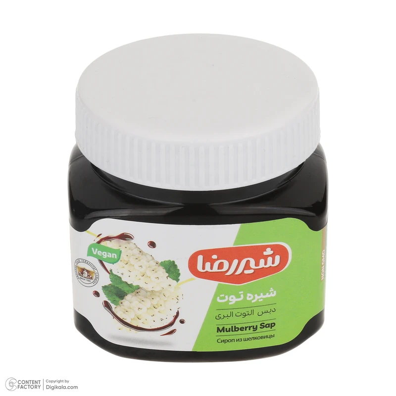 شیره توت شیررضا که محصولی کاملا طبیعی و بدون مواد افزودنی و نگهدارنده می‌باشد، حاصل فرآوری توت تازه، سالم و خوشمزه بوده که با استفاده از ماشین آلات و تجهیزات پیشرفته، تولید و جهت مصرف در اختیار شما قرار گرفته است. شیره توت به علت داشتن انواع ویتامین‌های گروه ب در کاهش و رفع ترس، عصبانیت، خمودی و اضطراب و هیجان موثر است. همچنین مصرف این شیره به رفع بی حسی و کرختی و ضعف عمومی بدن کمک میکند. استفاده از شیره توت سفید برای کودکان و نوجوانان در حال رشد بسیار مفید است و به رشد بهتر، افزایش قدرت یادگیری و تامین انرژی مورد نیاز کودکان کمک میکند.