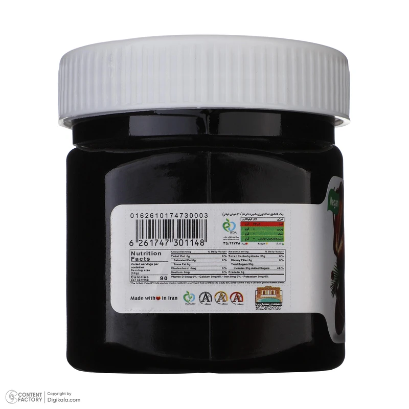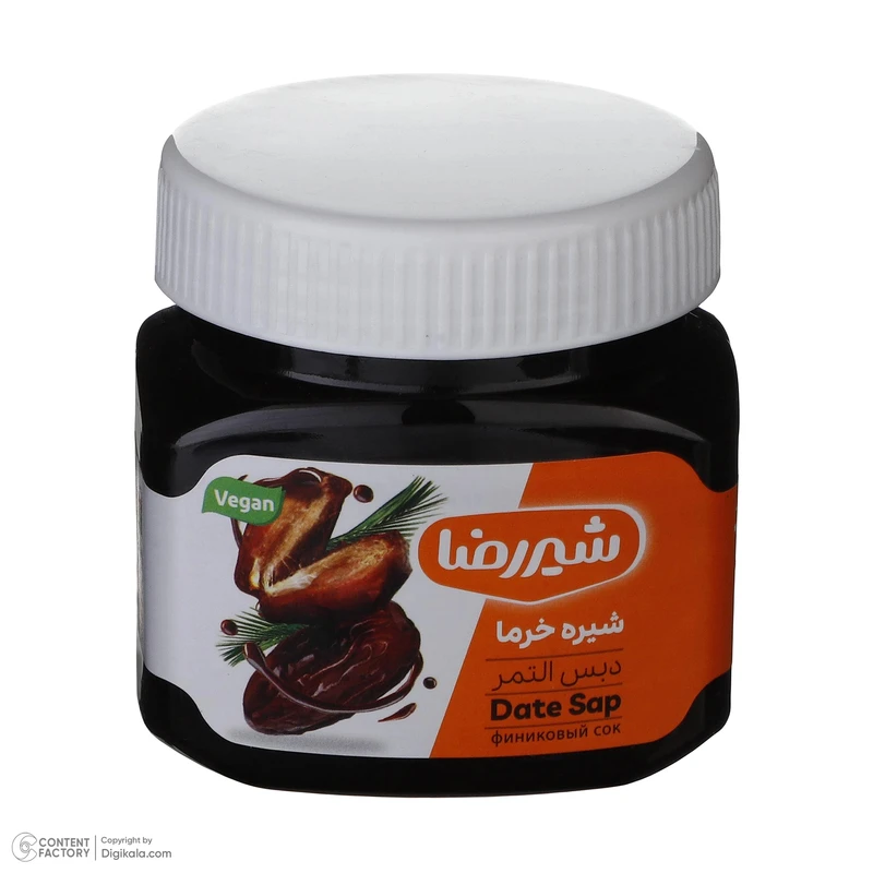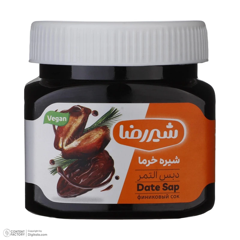 شیره خرما شیررضا که محصولی کاملا طبیعی و بدون مواد افزودنی و نگهدارنده میباشد، حاصل فرآوری خرمای تازه، سالم و خوشمزه بوده که با استفاده از ماشین آلات و تجهیزات پیشرفته، تولید و جهت مصرف در اختیار شما قرار گرفته است.شیره خرما حاوی پروتئین، قند طبیعی مواد معدنی و ویتامین هایی مانند B1، B2، B3 و B5 و همچنین A1 و C است که در صورت مصرف دیگر نیازی به مولتی ویتامین ها ندارید. این شیره حاوی قندهای طبیعی مانند گلوکز، ساکارز و فروکتوز هستند و برای میان وعده یک انتخاب مناسب به حساب می آیند.