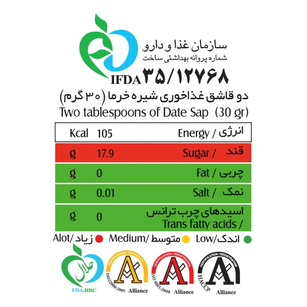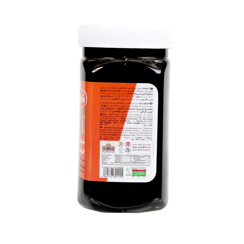 شیره خرما شیررضا که محصولی کاملا طبیعی و بدون مواد افزودنی و نگهدارنده میباشد، حاصل فرآوری خرمای تازه، سالم و خوشمزه بوده که با استفاده از ماشین آلات و تجهیزات پیشرفته، تولید و جهت مصرف در اختیار شما قرار گرفته است.شیره خرما حاوی پروتئین، قند طبیعی مواد معدنی و ویتامین هایی مانند B1، B2، B3 و B5 و همچنین A1 و C است که در صورت مصرف دیگر نیازی به مولتی ویتامین ها ندارید. این شیره حاوی قندهای طبیعی مانند گلوکز، ساکارز و فروکتوز هستند و برای میان وعده یک انتخاب مناسب به حساب می آیند.
