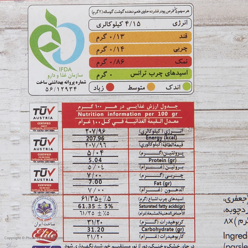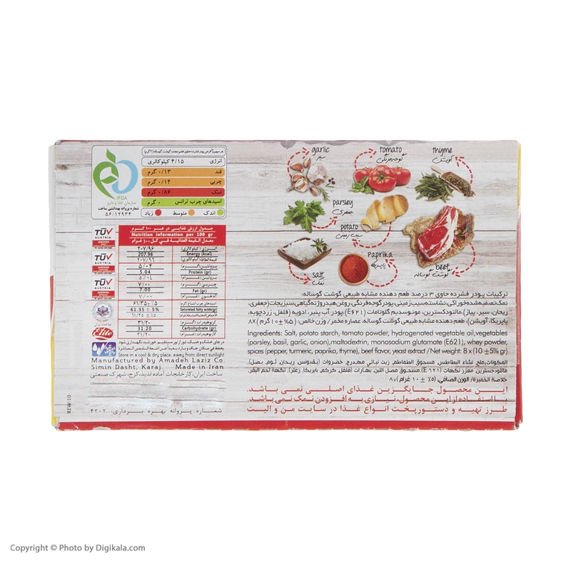 اکثر مواقع برای آشپزی و آماده کردن وعدههای غذایی ناهار و شام با محدودیت زمانی مواجه هستیم. با توجه به این محدودیت و همینطور قیمت بالای برخی از موادغذایی مانند انواع گوشت، گرفتن عصارهی آنها بهطور طبیعی امکانپذیر نیست. «الیت» با عرضهی انواع عصارهها چنین مشکلی را از سر راه آشپزهای حرفهای و کدبانوها برداشته است. عصاره گوشت گوساله که در تصاویر دیده میشود نیز از محصولات این برند است. علاوه بر دارا بودن عصاره گوشت گوساله، این پودر فشرده حاوی سبزیجات و ادویههای معطر مانند ریحان، جعفری، زردچوبه، فلفل و… است تا طعم و عطری خاص به غذا بخشد. با داشتن این عصاره در آشپزخانه قادر هستید انواع غذاهای ایرانی و خارجی را با طعمی بهیادماندنی و لذیذ طبخ و سرو کنید. «الیت» برند اصلی شرکت «آماده لذیذ» است و در زمینه تولید انواع ادویهها، عصارهها و غذاهای آماده و نیمهآماده فعالیت دارد. این تولیدات از ترکیب موادغذایی خشک که طی فصول مختلف جمعآوری شدهاند، تهیه میشوند.