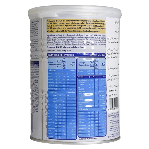 پپتامن جونیور غذایی کامل بر پایه پپتید است که جهت رفع نیازهای تغذیه ای (ریز مغذی و درشت مغذی) در کودکان (10-1 سال) که از سو هضم، سو جذب و یا سوتغذیه ناشی از بیماری های مزمن و حاد رنج می برند مورد استفاده قرار می گیرد. در زیر به بررسی مشخصه های این محصول می پردازیم : انرژی : پپتامن جونیور محصولی ایزوکالریک است که قادر به تامین Kcal/ml2- 1 انرژی می باشد. به این معنی که شما با افزایش تعداد پیمانه ها قادر به دریافت میزان انرژی بیشتری از محصول هستید. هر وعده 250 میلی لیتری محلول استاندارد پپتامن جونیور قادر به تامین 250 کیلوکالری انرژی است. پروتئین: پپتامن جونیور محصولی حاوی 12% پروتئین است و تمامی این مقدار به Whey پروتئین اختصاص داده شده استWhey .، پروتئینی با کیفیت و ارزش بیولوژیک بالا است که قادر به تامین مقادیر مناسبی از اسیدهای آمینه ضروری و اسیدهای آمینه شاخه دارمی باشد. یکی از ویژگی های بارز پپتامن جونیور، پپتید بودن پروتئین محصول است. به این معنی که ساختار پروتئین محصول در اثر هیدرولیز شکسته شده و به صورت پپتید در آمده است که به هضم وجذب سریع تر آن کمک می کند. باید توجه داشت از آنجائیکه محصول فاقد گلوتن بوده در بیماران مبتلا به سلیاک قابل استفاده است. چربی: ترکیب لیپیدی پپتامن جونیور به گونه ای طراحی شده است که ضمن تامین سریع انرژی برای بدن، تحمل گوارشی بهتری را برای کودک فراهم می کند. در این محصول 33% از نیاز انرژی روزانه از چربی تامین می گردد که از این میزان 60% به MCT تعلق دارد.MCT یا تری گلیسیریدهای زنجیره متوسط نوع خاصی چربی هستند که به دلیل جذب بهتر و سریع تر، انرژی را سریعا برای بدن فراهم می کنند. کربوهیدرات: در پپتامن جونیور 55% از نیاز انرژی روزانه از کربوهیدرات تامین می گردد. ترکیب کربوهیدراتی محصول شامل مالتودکسترین و نشاسته سیب زمینی است و از آنجائیکه محصول فاقد لاکتوز می باشد بنابراین می تواند توسط افرادی که عدم تحمل به لاکتوز دارند به راحتی استفاده شود. از آنجائیکه در پپتامن جونیور از مقادیر متوسطی از کربوهیدرات استفاده شده است، محصول دارای اسمولالیته/اسمولاریته پایینی بوده که به تحمل گوارشی بهتر محصول کمک می کند. علاوه بر این، ترکیب کربوهیدراتی فرمولاسیون پپتامن جونیور به گونه ای است که باعث آزادسازی کند گلوکز در جریان خون میشود.