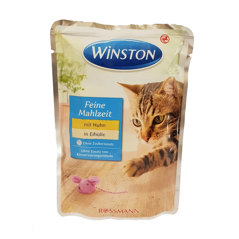 غذای گربه وینستون مدل WeiBfisch وزن 100 گرم همراه سوپ گربه وینستون مدل Huhn in Eihulle وزن 100 گرم