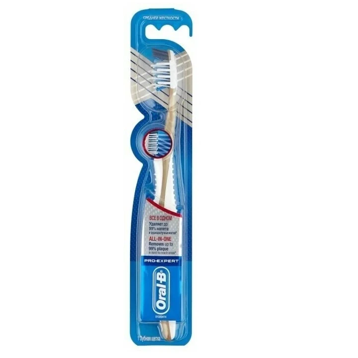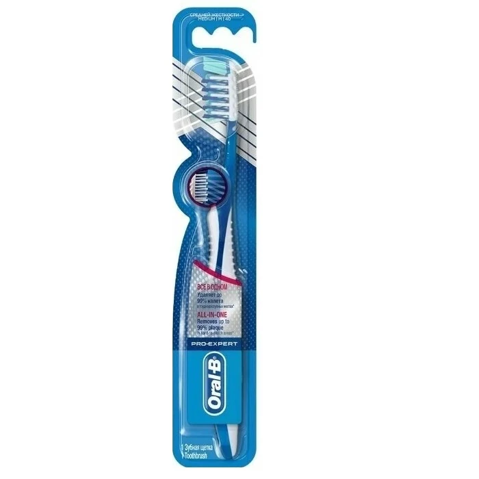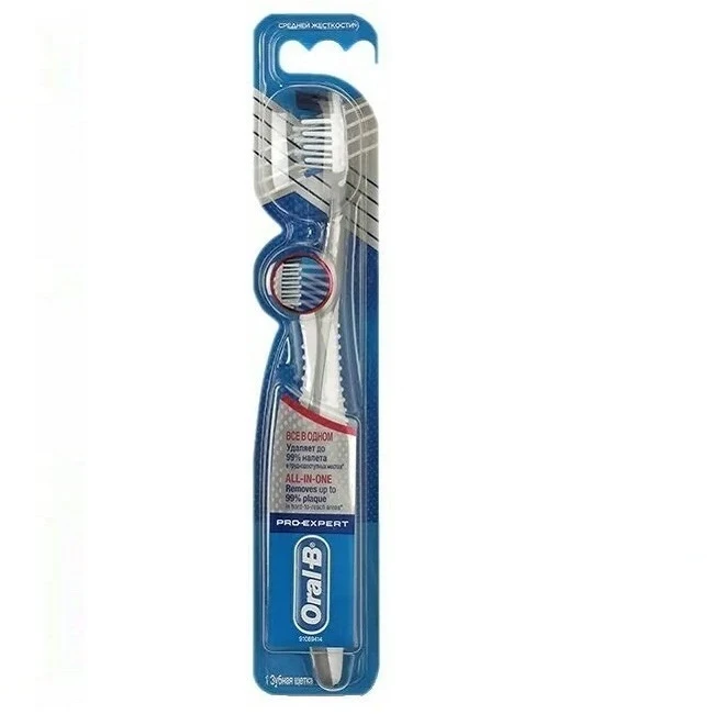 مسواک اورال-بی مدل Pro-Expert محصولی همه کاره برای محافظت از لثه و مینای دندان است. این مسواک با الیاف Power Tip با زاویه 16 درجه متقاطع نسبت به مسواک های معمولی نفوذ بهتری داشته و به نقاط دور از دسترس دهان نفوذ کرده و تمیزی بیشتری به ارمغان می آورد. الیاف برس مسواک بصورت گرد طراحی شده تا در برابر لثه و مینای دندان ملایم عمل کرده و از التهاب لثه جلوگیری نماید. مسواک Oral B All In One با دسته ارگونومیک برای استفاده ای آسان در پشت خود مجهز به زبان شویه می باشد که باعث تمیزی میکروب ها از سطح زبان شده از بوی بد دهان جلوگیری می نماید. با پاک کردن پلاک های میکروبی سطح دندان علاوه بر سفیدی دندان از بوی بد دهان نیز جلوگیری می نماید. دسته ی مسواک اورال بی Oral B All In One به صورت ارگونومیک طراحی شده است تا برای نگهداشتن در دست آسان باشد . کشور سازنده این محصول کشور ایرلند می باشد