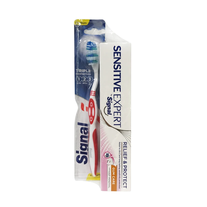 مسواک سیگنال مدل Triple Protection با برس متوسط به همراه خمیر دندان سیگنال مدل Gum Care وزن 100 گرم