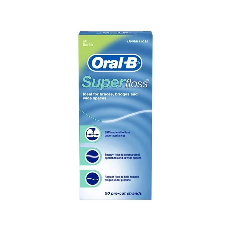 نخ دندان ارتودنسی اورال بی سوپر فلاس نعنایی Oral B Super Floss mint حاوی 50 رشته نخ با مقاومت بسیار بالا برای دندان های ارتودنسی شده می باشد.