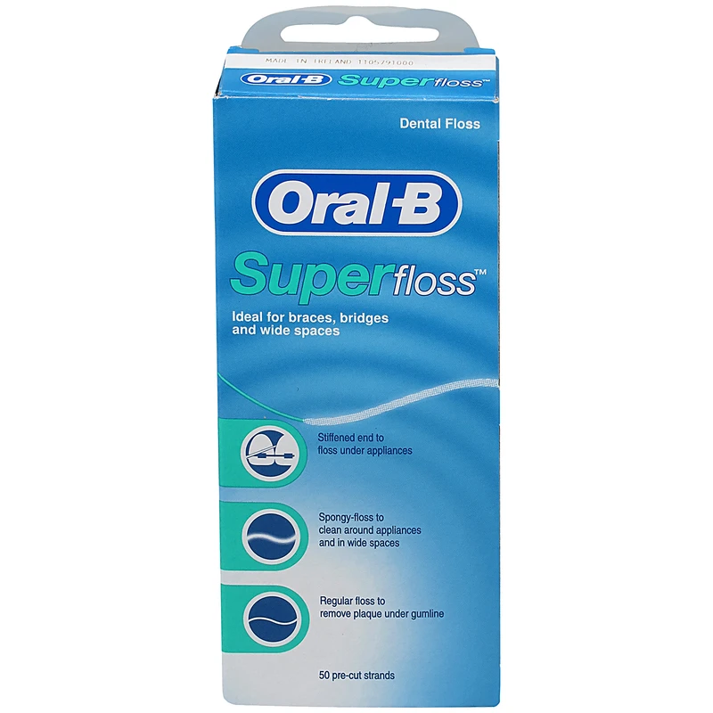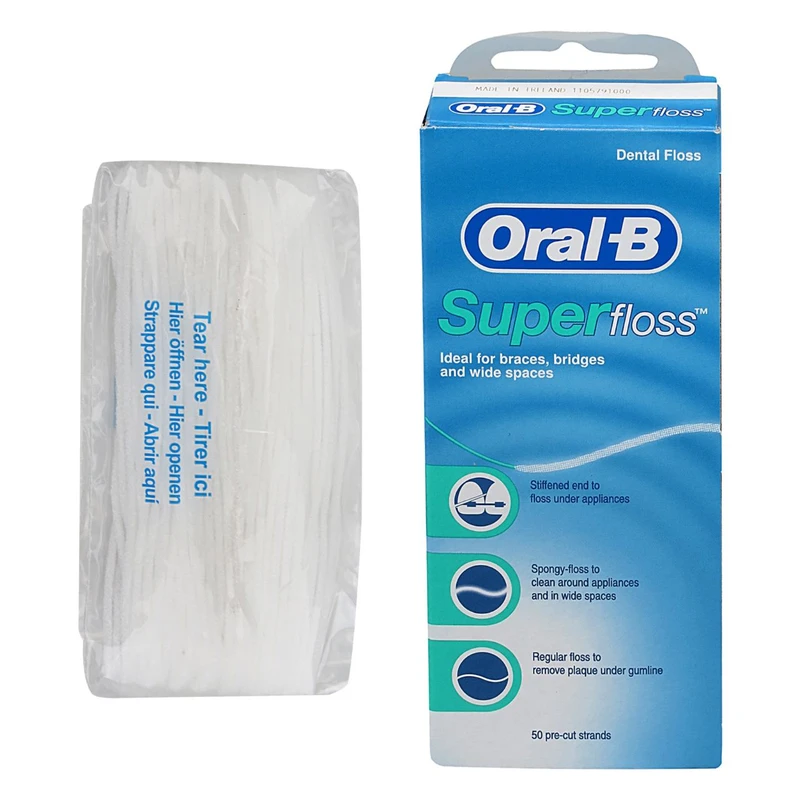 نخ دندان اورال-بیsuper floss، استفاده از نخ را بسیار دلپذیر می کند.این نخ دندان به راحتی و بدون آسیب به لثه های شما، در فضای بین دندان ها می لغزد و به طور موثر پلاک را از بین می برد. این محصول به دلیل طراحی بی نظیرش، با ابعاد کوچک بسته بندی و 50 عددنخ دندان، به مدت زیادی قابل استفاده است و می توانید آن را همواره همراه خود داشته باشید.لازم به ذکر است این نوع نخ دندان برای دندانهای ارتودنسی شده بسیار مناسب میباشد و توصیه اقلب دندانپزشکان برای دندانهای ارتودنسی شده نخ superfloss میباشد.