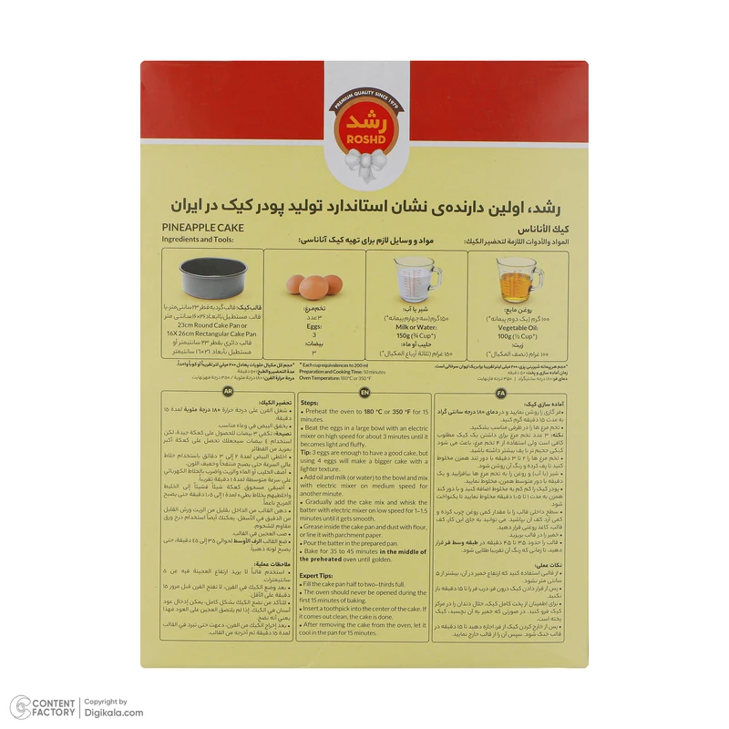 طعمهای میوهای یکی از خوش مزه ترین و پرطرفدارترین طعمها هستند که در بیشتر خوراکیها وجود دارند. کیک نیز یکی از خوراکیهایی است طعمهای میوهای آن پرطرفدار است و به دلیل وجود ارد گندم در ترکیب ان، به عنوان یک میان وعده کامل مصرف میشود. پودر کیک رشد یکی از تولیدکنندگان قدیمی و پرطرفدار است که محصولات با کیفیت تولید میکند و در اختیار مصرف کنندگان قرار میدهد. پودر کیک 500 گرمی آناناسی رشد، مقدار مناسبی برای یک مهمانی 8 نفره است و اگر به عنوان میان وعده استفاده شود، میتواند برای چجند روز مناسب باشد.