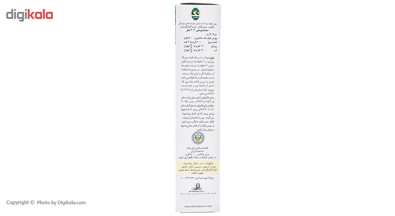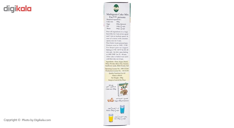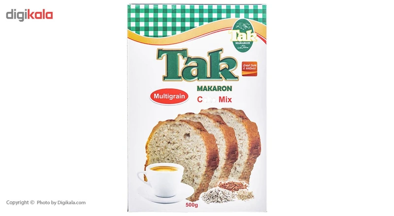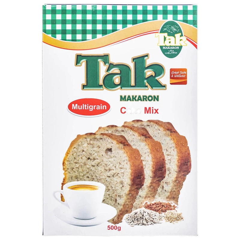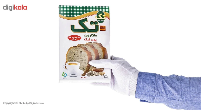 پودر کیک حاوی مغز دانههای خوراکی تک ماکارون با وزن 500 گرم و بستهبندی به صورت جعبه با ابعاد 15 × 4.5 × 21 سانتیمتر ارائه میشود. این محصول برای 4 الی 6 نفر مناسب است. ترکیبات این محصول شامل آرد، شکر، نشاسته، شیر خشک، پودر آب پنیر، سبوس، کتان، کنجد، تخمه آفتابگردان، نمک طعام و بهبوددهنده است. طرز تهیه آن به این صورت است که ابتدا پودر کیک را با 4 عدد تخم مرغ، 160 میلیلیتر یا 3/4 لیوان آب و 140 میلیلیتر روغن را در یک ظرف بزرگ بریزید و به مدت 2 دقیقه به آرامی و 3 دقیقه با سرعت متوسط هم بزنید در صورتی که از مخلوطکنهای برقی استفاده میکنید، به مدت 5 دقیقه با سرعت متوسط این کار را انجام دهید تا خمیری خوب و یکنواخت و بدون گلوله حاصل شود. سپس قالب را با روغن چرب کنید و خمیر را درون آن بریزید. مواد اولیه را درون فر که پیش از این به دمای 190 درجه سانتیگراد است را به مدت 35 الی 40 دقیقه قرار دهید. لازم به توضیح است میزان حرارت و مدت زمان نسبت به عمق و نوع ظرف می تواند متفاوت باشد. پس از پخت، کیک را از فر خارج کرده و در دمای معمولی اتاق قرار دهید تا خنک شود. پس از آن کیک را به آرامی از قالب خارج کنید و بسته به سلیقه خود تزئین کرده و به عنوان صبحانه یا عصرانه میل فرمایید یا در مراسم مختلف سرو کنید.
