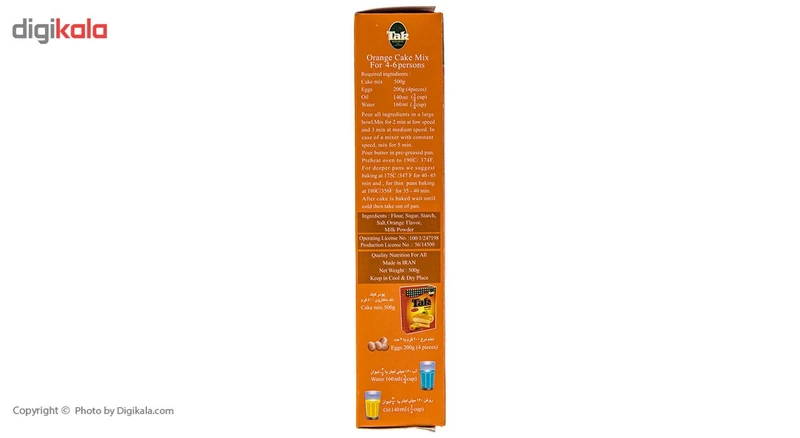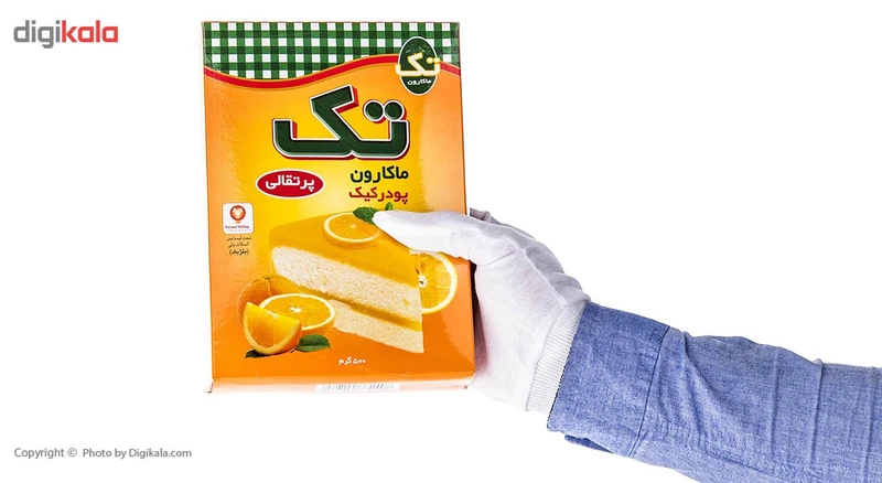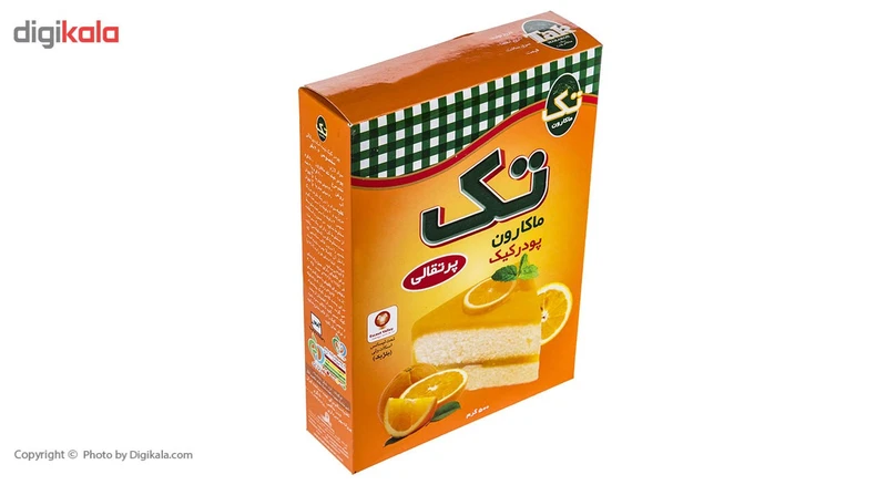 پودر کیک پرتقالی تک ماکارون با وزن 500 گرم و بستهبندی به صورت جعبه با ابعاد 15 × 4.5 × 21 سانتیمتر ارائه میشود. این محصول برای 4 الی 6 نفر مناسب است. ترکیبات این محصول آرد، شکر، نشاسته، طعم پرتقالی، شیر خشک و بهبود دهنده است. طرز تهیه آن به این صورت است که ابتدا پودر کیک را با 4 عدد تخم مرغ، 160 میلیلیتر یا 3/4 لیوان آب و 160 میلیلیتر روغن را در یک ظرف بزرگ بریزید و به مدت 2 دقیقه به آرامی و 3 دقیقه با سرعت متوسط هم بزنید در صورتی که از مخلوطکنهای برقی استفاده میکنید، به مدت 5 دقیقه با سرعت متوسط این کار را انجام دهید تا خمیری خوب و یکنواخت حاصل شود. سپس قالب را با روغن چرب کنید و خمیر را درون آن بریزید. دمای فر را به 190درجه سانتیگراد یا 374 درجه فارنهایت انتخاب کنید. توجه داشته باشید برای قالبهایی با عمق زیاد دمای فر 175 درجه سانتیگراد و 347 درجه فارنهایت و مدت 40 الی 45 دقیقه و برای قالبهای با عمق کمتر دمای 180 درجه سانتیگراد و 356 درجه فارنهایت و زمان 35 الی 40 دقیقه برای پخت کامل کیک پیشنهاد میشود. پس از پخت، کیک را از فر خارج کرده و در دمای معمولی اتاق قرار دهید تا خنک شود. پس از آن کیک را به آرامی از قالب خارج کنید و بسته به سلیقهی خود با خامه یا تکههای میوه مانند توت فرنگی تزئین کرده و به عنوان صبحانه یا عصرانه میل کنید.