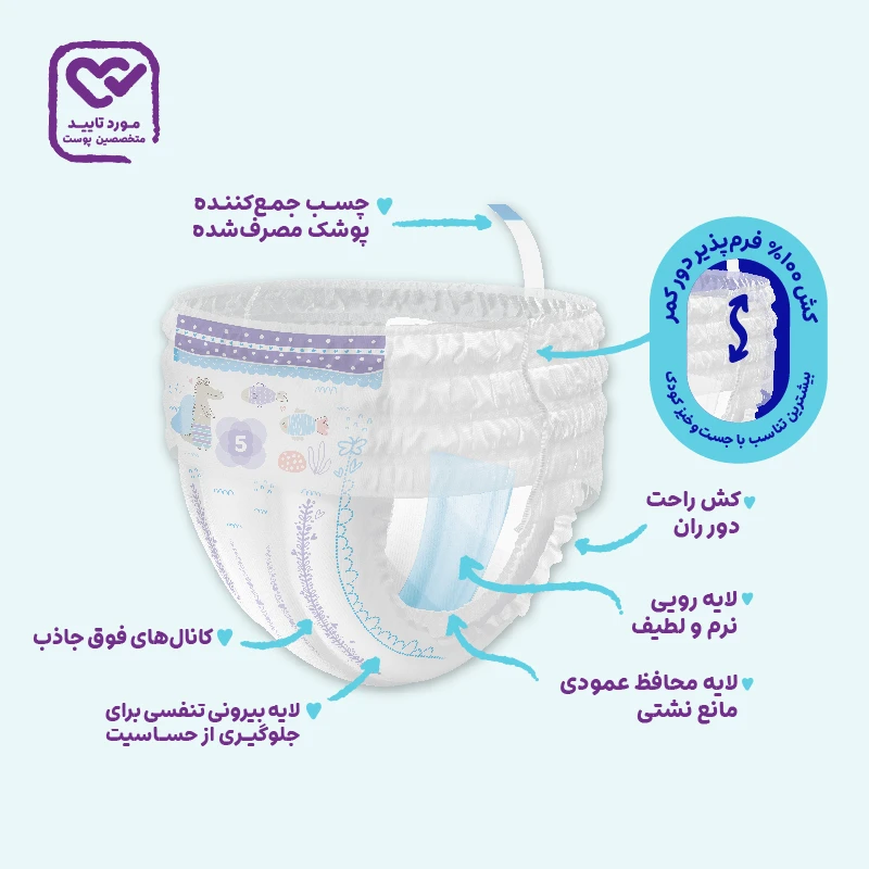 پوشک شورتی کانال‌دار مای‌بیبی با کش 100 درصد فرم‌پذیر دور کمر با اضافه شدن انحنای S مانند، جست و خیز راحت را برای کودک فراهم کرده و با لایه رویی به نرمی پنبه، از پوست حساس او، محافظت می‌کند. این محصول نوآورانه، به تایید متخصصین پوست رسیده و با تعویض آسان و سریع، تجربه شیرینی برای کودکان و والدین به همراه دارد.