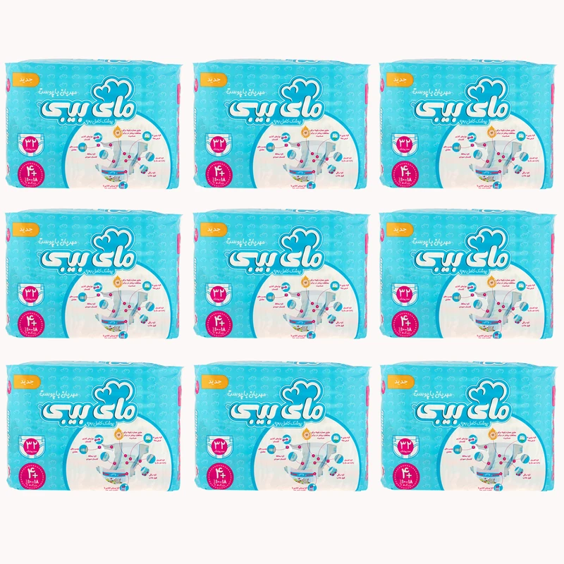 پوشک مای بیبی آبی مدل مهربان سایز 4Plus بسته 32 عددی مجموعه 9 عددی