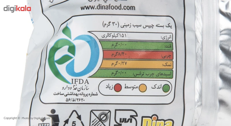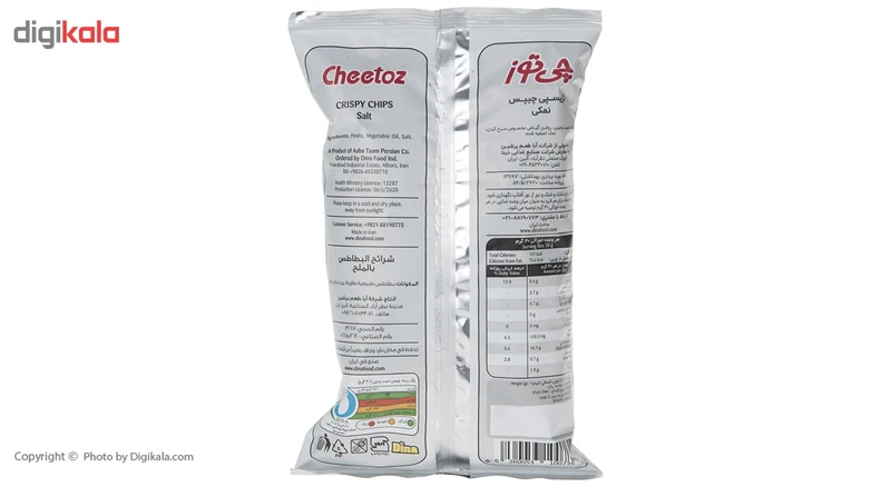شمارهی پروانهی بهداشت این محصول چیتوز که در بستهبندی سفید و سبزرنگ به ابعاد 17 × 26 سانتیمتر عرضه شده، 2620/ظ/56 است. چیپس ساده چیتوز فاقد اسیدهای چرب ترانس و قند است و در هر 30 گرم آن 0.27 گرم نمک وجود دارد. بستهای که مشاهده میکنید، بستهی 60 گرمی کتل چیپس چیتوز است و در هر 30 گرم 151 کیلوکالری انرژی دارد. با وجود این کالری زیاد باز هم توصیه میشود این محصول را برای وعدهی اصلی غذایی استفاده نکنید و بهعنوان میانوعده یا در کنار غذا مصرف شود.
